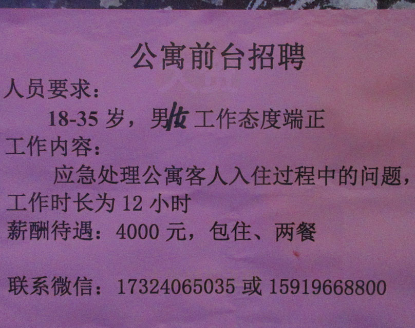 贝岗·公寓前台招聘 18-35岁 男女皆可 每天工作12小时 月薪4千 包吃住 微电17324065035 |