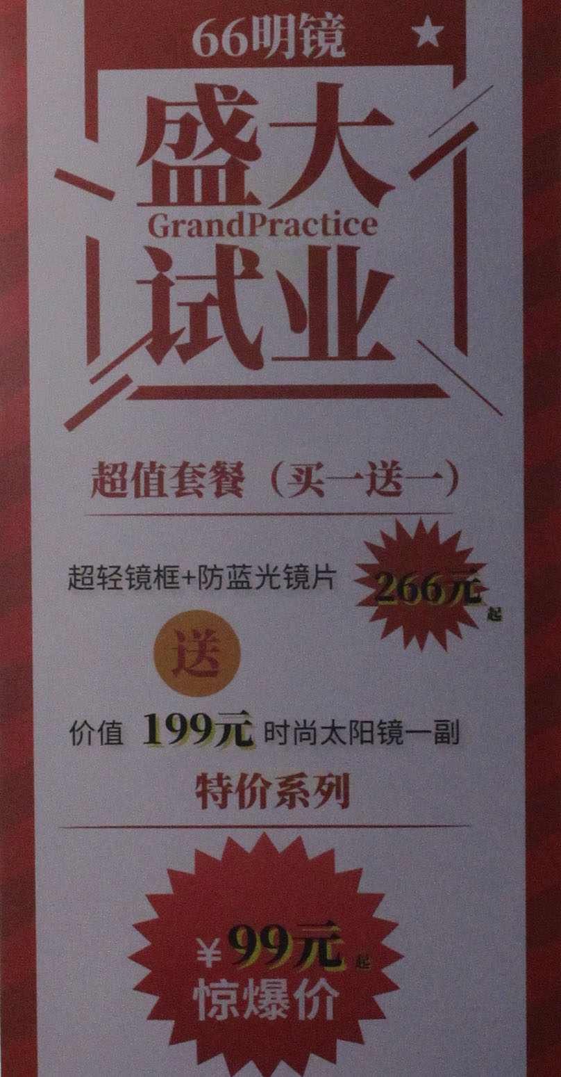 试业期间,超值套餐买一送一,超轻镜框+防蓝光镜片266元起,送价值199元时尚太阳镜一副;还有特价系列,惊爆价99元起