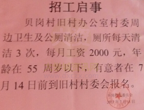 【招工启事】贝岗村委周边卫生清洁员 | ||||||