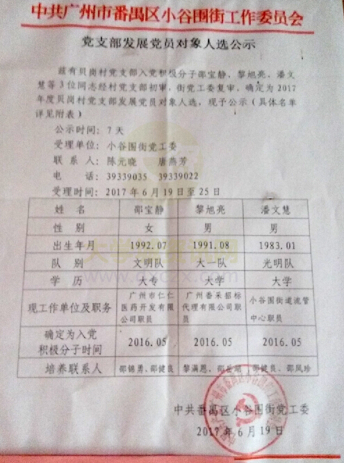中共广州市番禺区小谷围街工作委员会 党支部发展党员对象人选公示 | ||||||