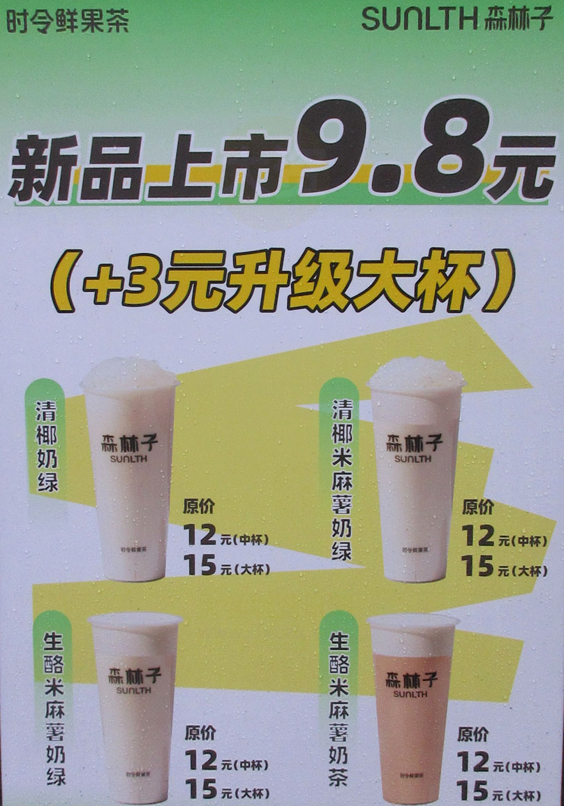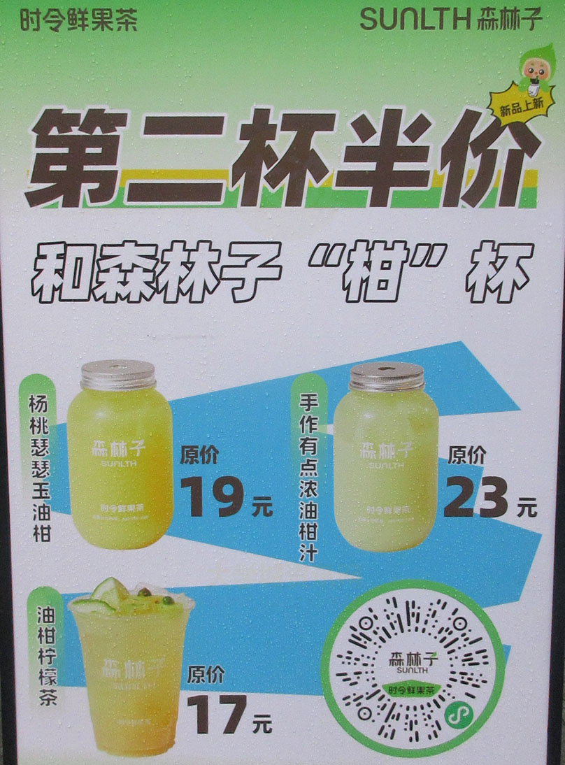 南商街八号楼东北角临街 森林子鲜果茶 新品上市9.8元 第二杯半价 +3元升级大杯 | ||||||