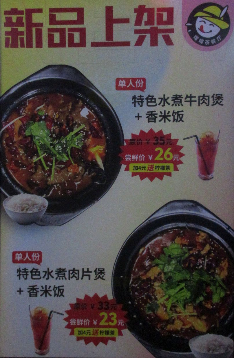 东门广场T8栋西列中北 噹噹茶餐厅 新品上架 特色水煮牛肉煲+香米饭,尝鲜价26元,特色水煮肉片煲+香米饭,尝鲜价23元,以上加4元还送柠檬茶 | ||||||