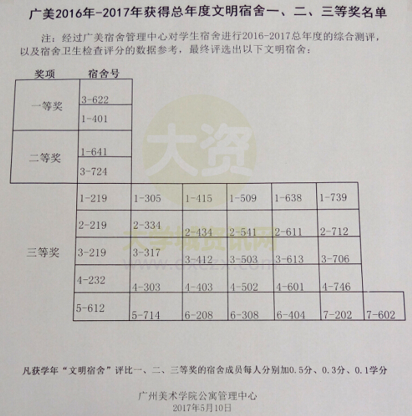 广美2016年-2017年获得总年度文明宿舍一、二、三等奖名单 | ||||||
