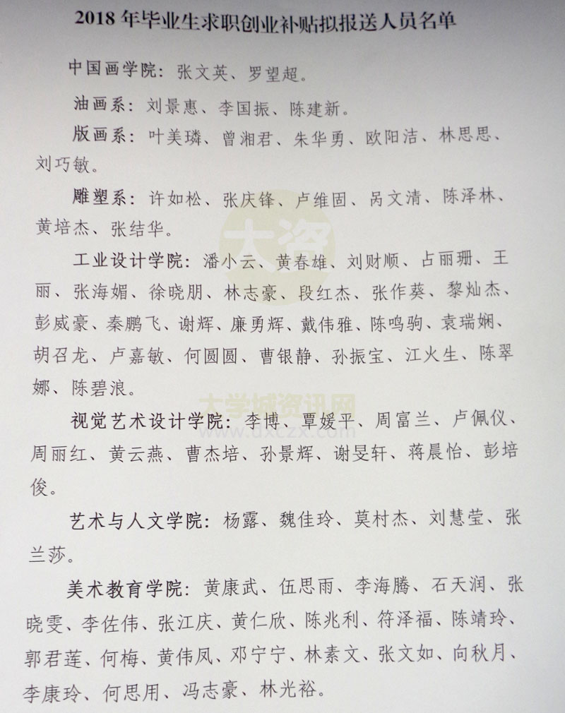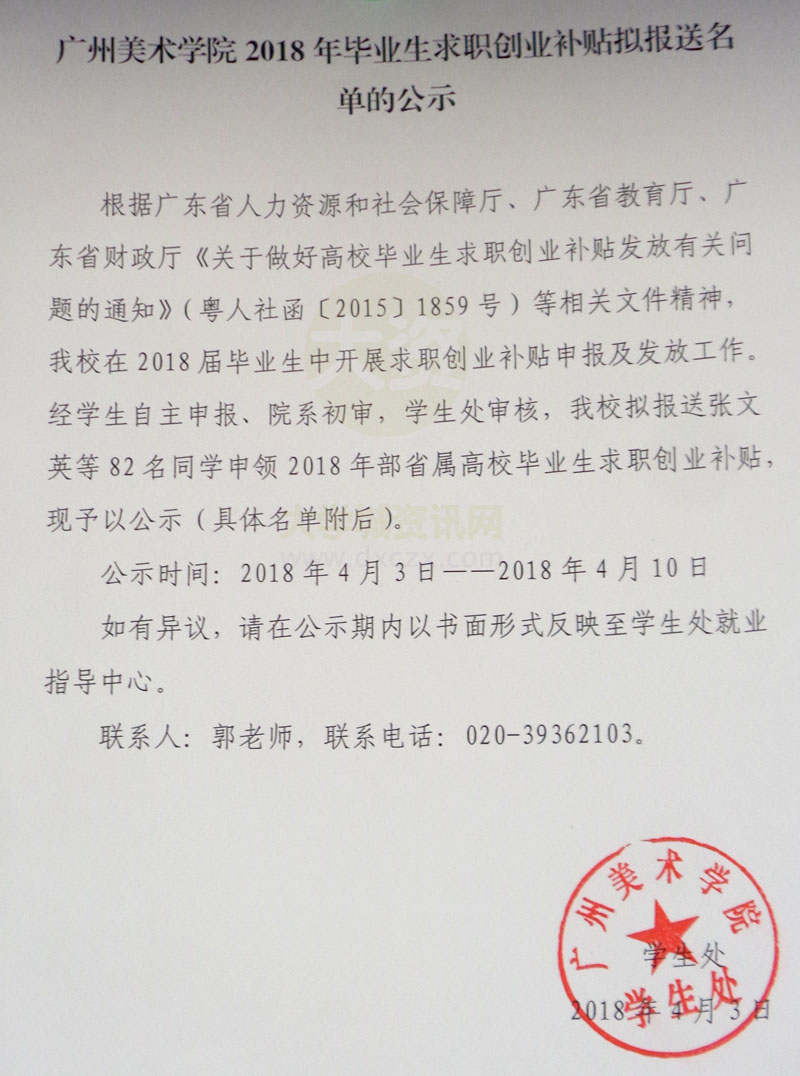 广州美术学院2018年毕业生求职创业补贴拟报送名单公示 | ||||||