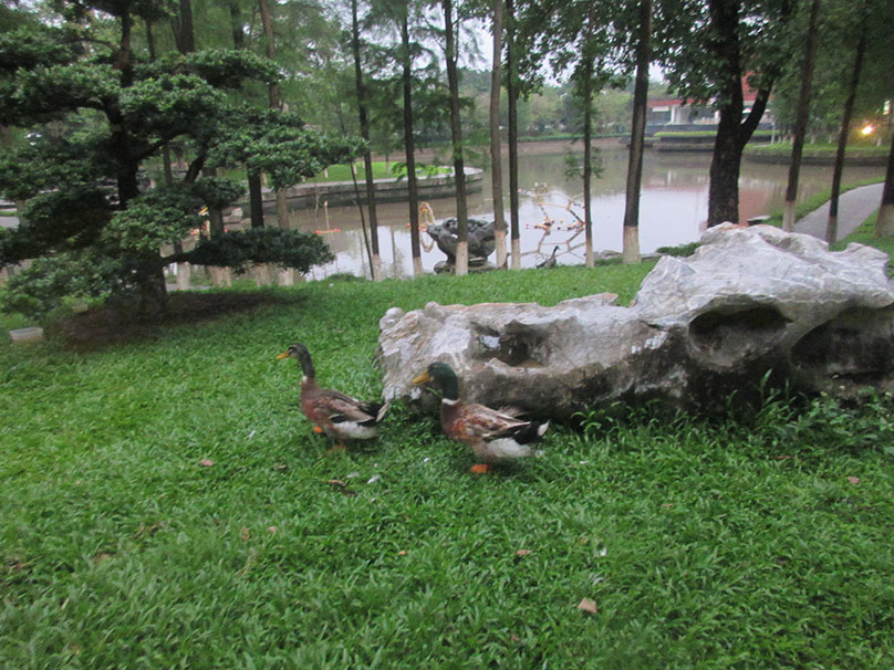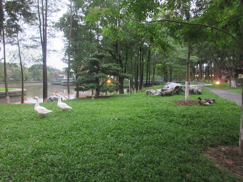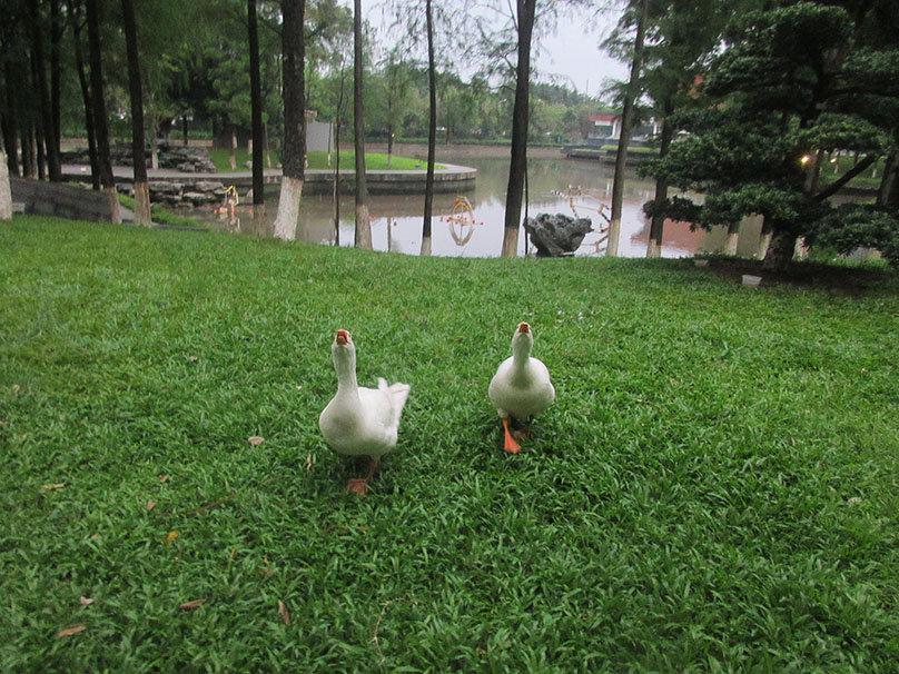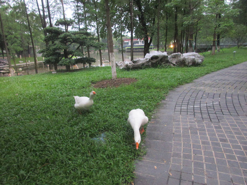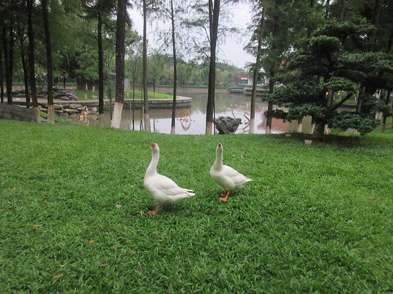 广美东湖边草地里这几只大白鹅还是鸭等的是不是已经长大了 有两个都会追着人跑了 | ||||||