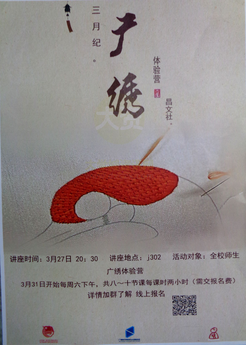 昌文社三月纪广绣体验营 讲座时间:3月27日20:30地点:J302 开课时间:3月31日 | ||||||