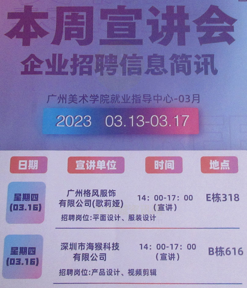 广州格风服饰有限公司(歌莉娅) 宣讲会 时间03.16周四下午14点-17点 教E栋318 招聘岗位-平面设计、服装设计 |