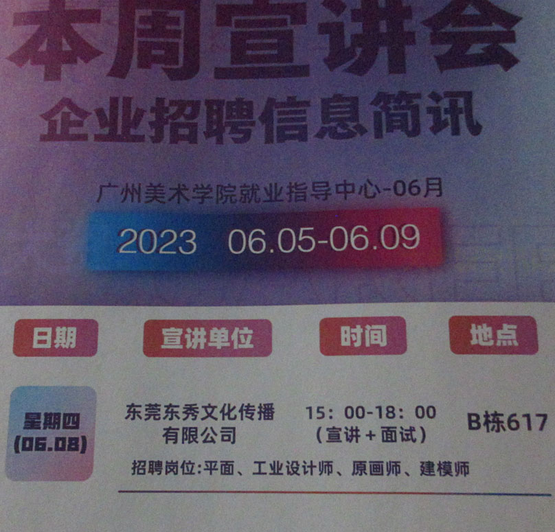 东莞东秀文化传播有限公司招聘宣讲会2023.06.08周四下午15点-18点 教学区B栋617 宣讲+面试 招聘岗位:平面、工业设计师、原画师、建模师 |