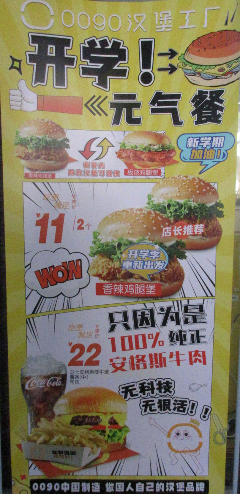 广美饭堂一楼东北角楼梯旁 0090汉堡工厂 开学元气餐 香辣鸡腿堡11元2个 芝士安格斯厚牛堡+薯条+可乐共22元 | ||||||