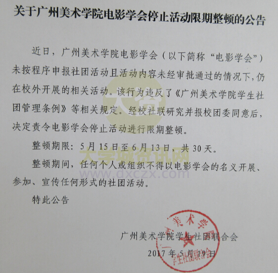 关于广州美术学院电影学会停止活动限期整顿的公告 | ||||||