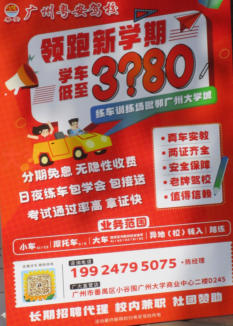 广大商中D区二楼东廊道中约 粤安驾校 新学期学车低至3?80元 练车训练场毗邻大学城 分期免息 无隐性收费 日夜练车包学会 包接送 | ||||||