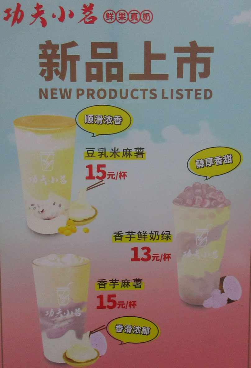 商中C区美食中心 功夫小茗 新品上市 豆乳米麻薯15元1杯,顺滑浓香;香芋鲜奶绿13元1杯,醇厚香甜;香芋麻薯15元1杯,香滑浓郁