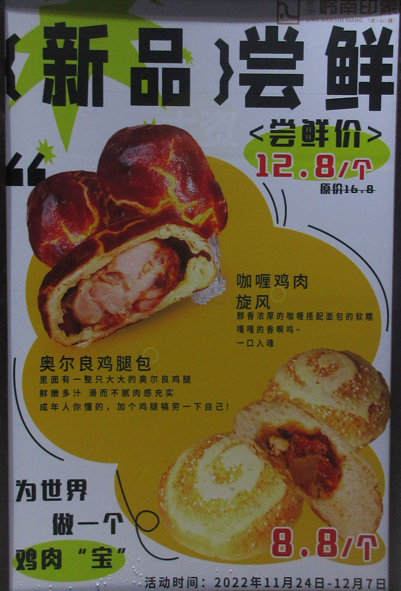 广大商中A区南横座东 岭南印象蛋糕店 新品尝鲜 奥尔良鸡腿包12.8元1个 咖喱鸡肉旋风8.8元1个 活动期2022.11.24-12.07 | ||||||