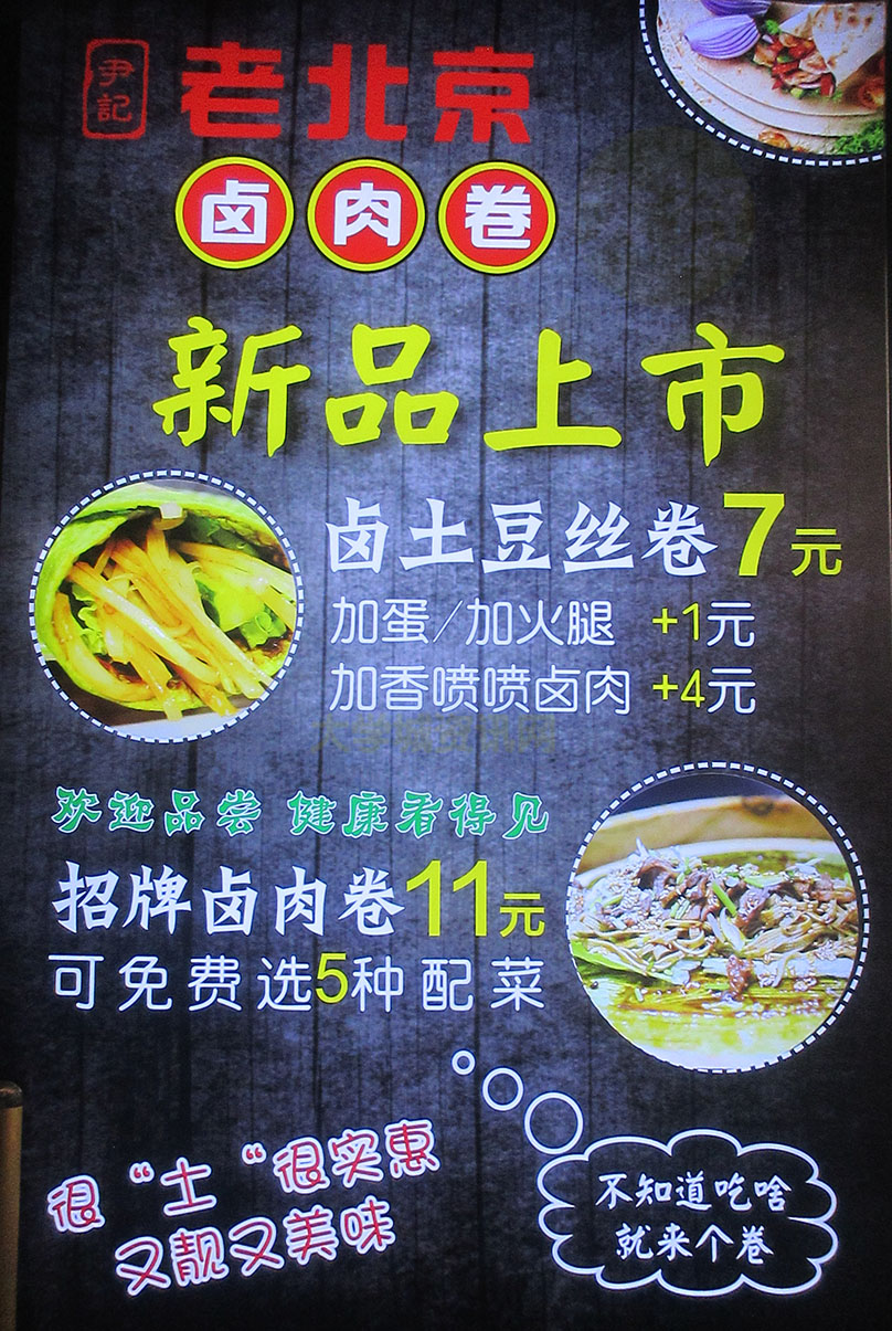 广大商中A区西侧外列 KFC和711之间 老北京卤肉卷 新品上市 卤土豆丝卷7元 加蛋&加火腿+1元 加香喷喷卤肉+4元 招牌卤肉卷11元 可选5种配菜 | ||||||