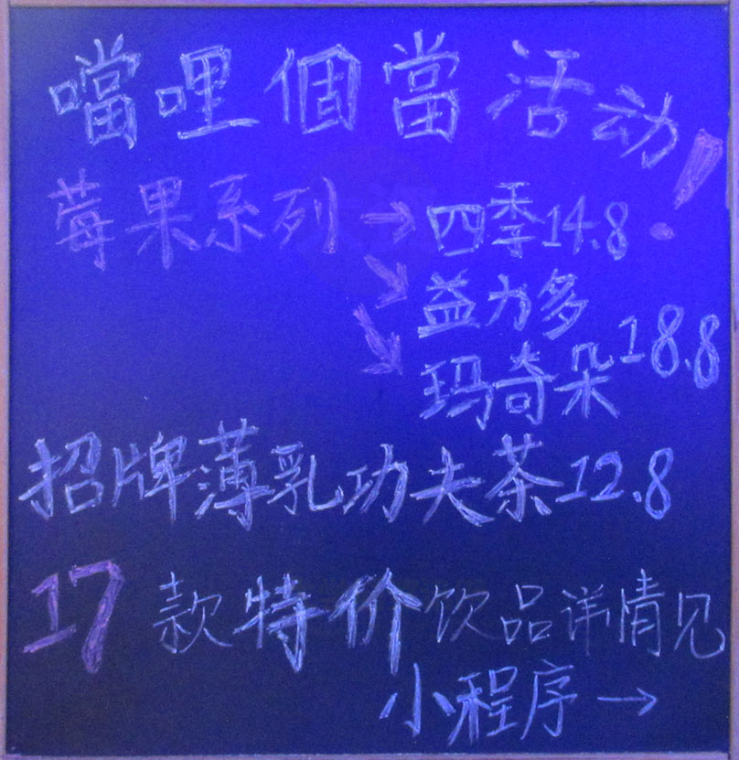 广大商中A区酒店大堂东南廊道 噹哩個當活动 莓果系列-四季14.8元,益力多&玛奇朵18.8元 招牌薄乳功夫茶12.8元 17款特价饮品详见小程序 | ||||||
