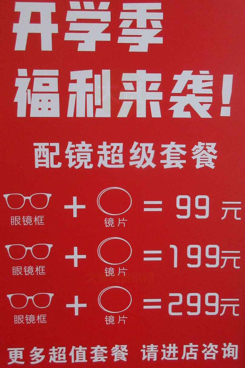广大商中D区西北角 快取眼镜超市 开学季福利 配镜超级套餐 眼镜框+镜片=99/199/299/399/499元 更多超值套餐,到店咨询