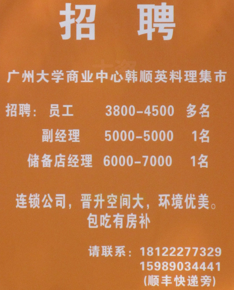 广大商中D区东南角 新店韩顺英料理集市 招聘员工多名3800-4500 副经理1名5000 储店经理1名6000-7000 联系电话18122277329 | ||||||