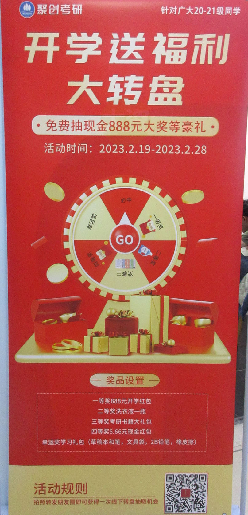 广大商中D区二楼北&近电梯口旁 聚创考研 开学送福利 大转盘 免费抽现金888元大奖等好礼 活动期2023.2.19-2.28 面向广大20级21级学生 | ||||||