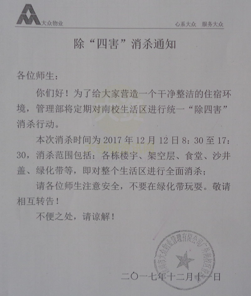 大众物业除“四害”消杀通知 12月12日8:30至17:30