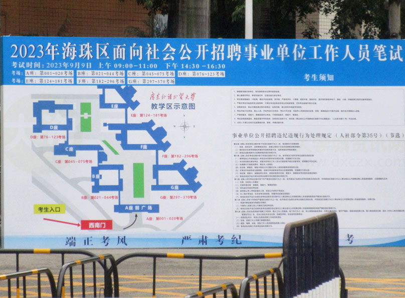 广外教学区今天(9月9号周六)作为考场 分上下午进行两场海珠区事业单位招考笔试 听说是上下午都是考相同科目分AB卷,应该是参考人数较多