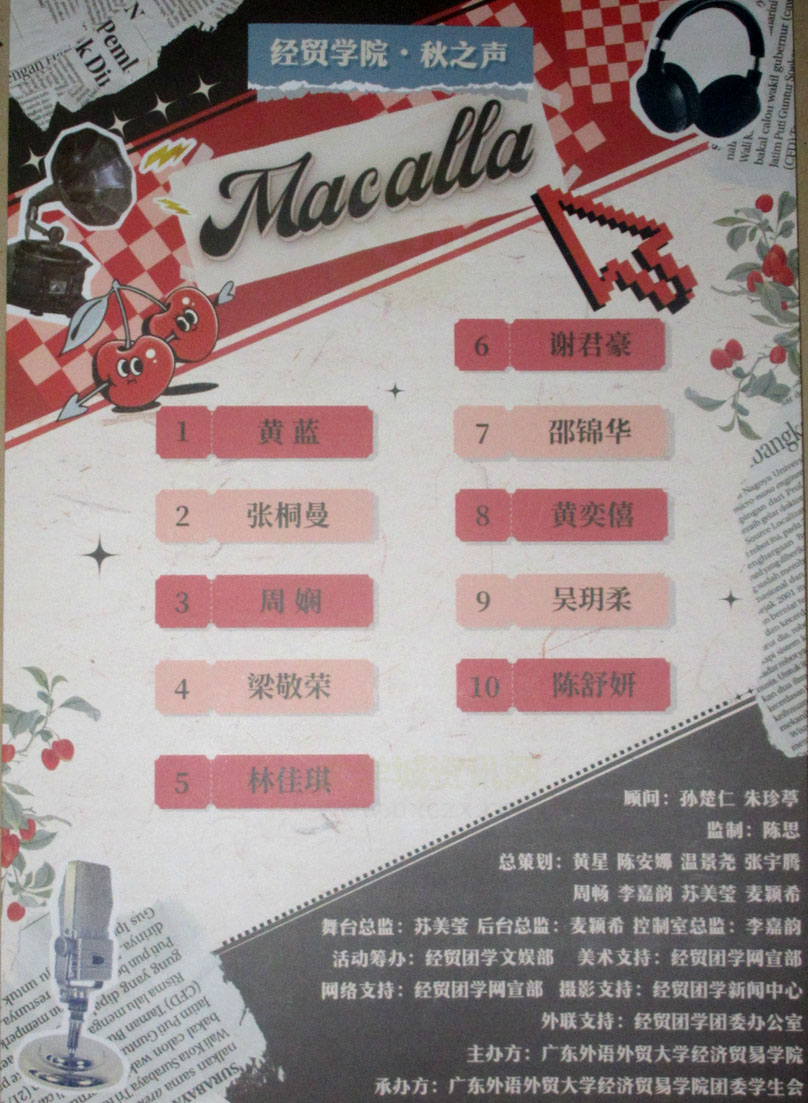 广外-经济贸易学院第二十九届Macalla秋之声歌唱比赛决赛今晚在生活区学活-多功能活动厅进行 789号顺位出场选手恰分获最终前三名&冠亚季军 邵锦华 黄奕僖 吴玥柔 | ||||||