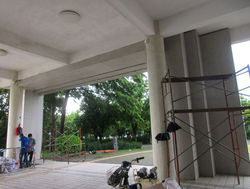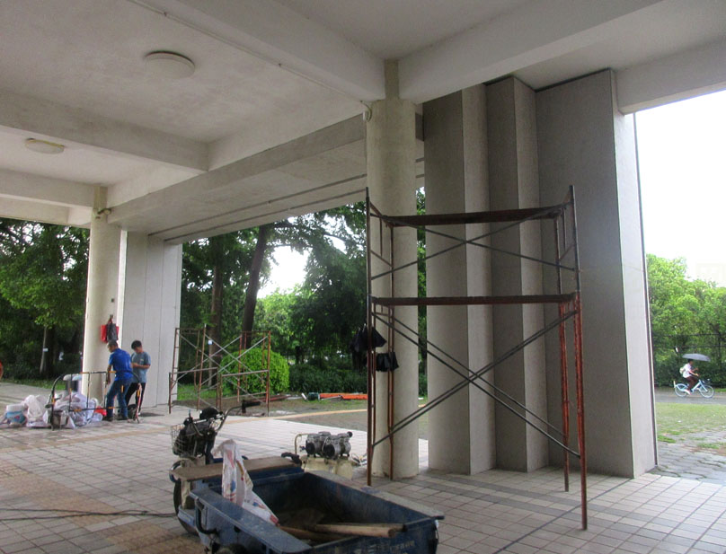就看这装修的门框基架这么大,可以想见做成后的体育学院的招牌标识等肯定是不小 一方面是没有必要这么大和突兀考虑,另一方面也为了体育馆外观外立面保持它原来原有的整体一致性 看着这样一个半露天的大门框,感觉走过经过,无形中给人一种额外的压抑感 或许完全弄好后,直视外观效果可能会好一些吧 看着这样一个大门框,贴靠体育馆半露天廊柱环道的背景衬托下,感觉走过经过或者就是眼睛看到,都有些无形中给人一种额外的压抑感,过大的附着导致而产生的不自然感