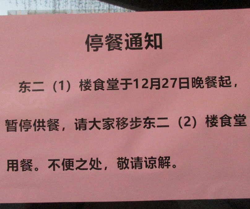 东区二饭一楼从12月27日晚开始放假,明年开学几时恢复供餐没说 东区二饭二楼寒假到过年期间有开 | ||||||