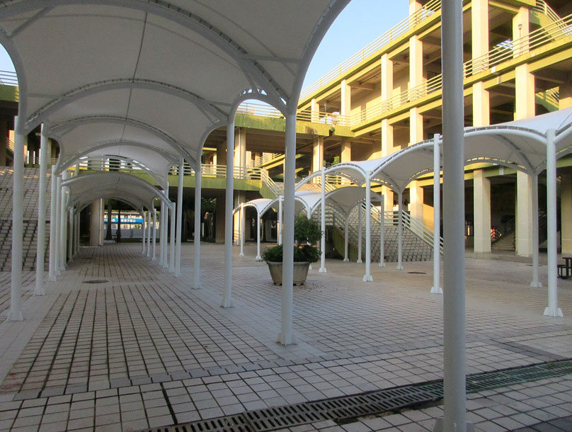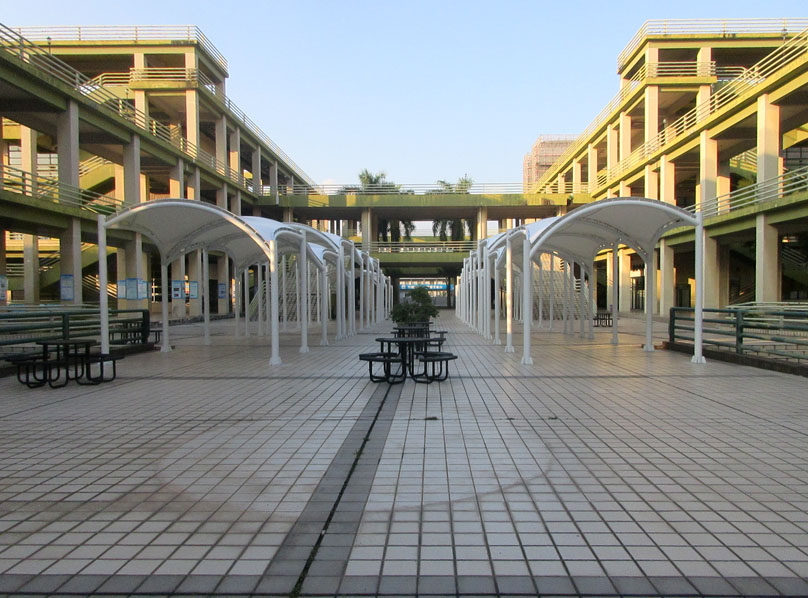 教学区教三教四与教五教六之间空地中央 之前看到的类似廊道连棚工程也已经弄好了喔 落成效果是这样的 看起来也没想象得那么密实立体占空间 | ||||||