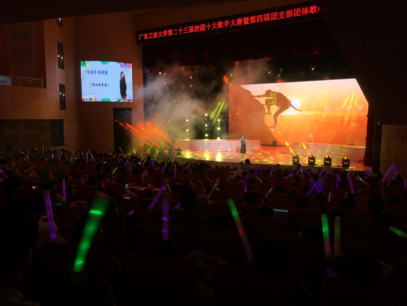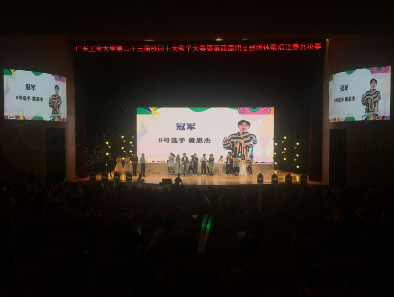 广东工业大学第23届校园十大歌手大赛今天下午在教学区文化活动中心进行 十位参赛选手可谓都实力不俗,经过可以说是激烈的竞争角逐后,最终来自龙洞校区经济学院的黄思杰获得本届十大歌手冠军,二三名分别是来自大学城校区的土木学院-余健鑫和环境学院-吴麦垒