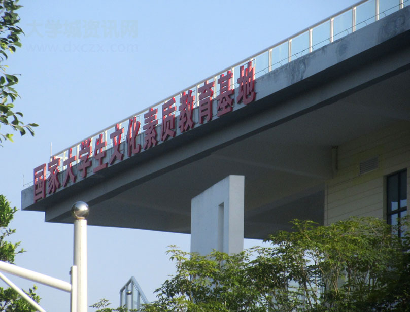 广工文化活动中心楼外立面东北角-北侧呈现:国家大学生文化素质教育基地 提示标语 楼下对应是外侧上转楼梯和刚最新装修好的青春报告厅