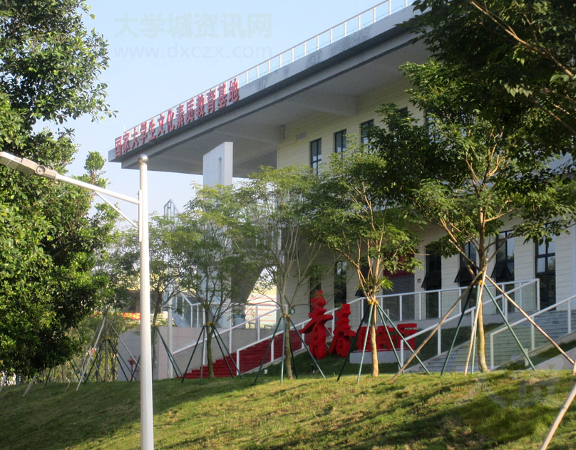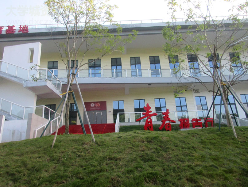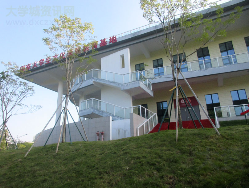 广工文化活动中心楼外立面东北角-北侧呈现:国家大学生文化素质教育基地 提示标语 楼下对应是外侧上转楼梯和刚最新装修好的青春报告厅 | ||||||
