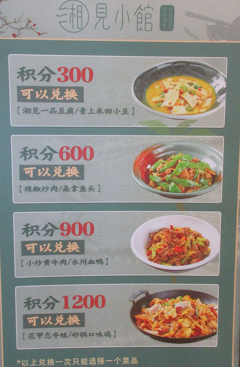 新天地三楼餐饮区南扶梯东侧 湘见小馆 积分300可换湘见一品豆腐&青上禾田小豆、积分600可换辣椒炒肉&桑拿鱼头、积分900可换小炒黄牛肉&永州血鸭、积分1200可换花甲恋牛蛙&砂锅口味鸡