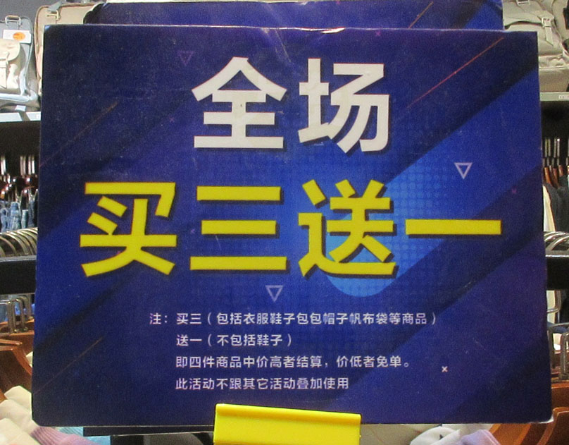 新天地内东廊道中 名创优品对面 JZ潮 全场买三送一 买三包括衣服鞋子包包帽子帆布袋等 送一不包括鞋子 即四件商品中价高者结算,价低者免单