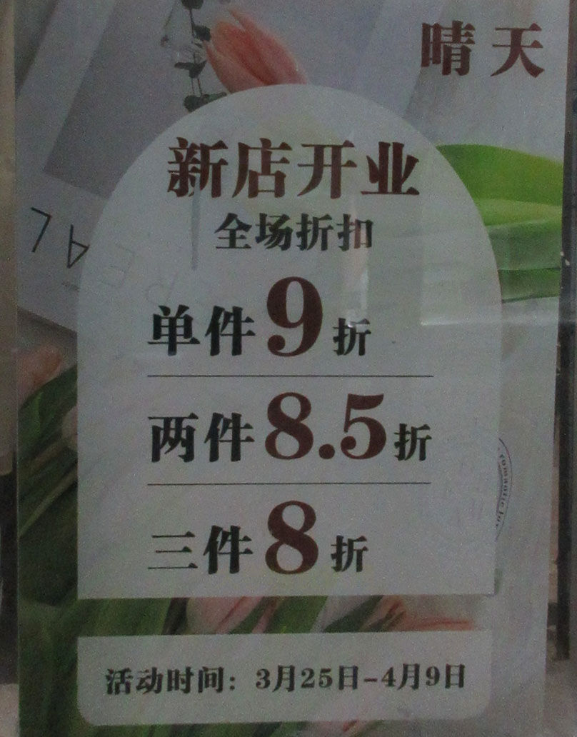 新天地一期二楼内西中廊道中段约 新开一家叫晴天的女装服饰店 开业期间3.25-4.9全场单件9折,两件8.5折,三件8折 | ||||||
