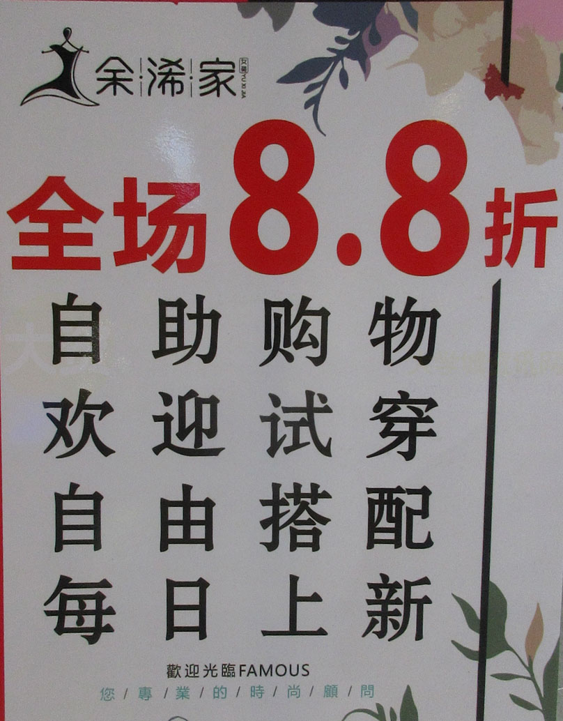 新天地一期一楼内东列南 余浠家女装服饰 全场8.8折 自助购物 欢迎试穿 自由搭配 每日上新 | ||||||