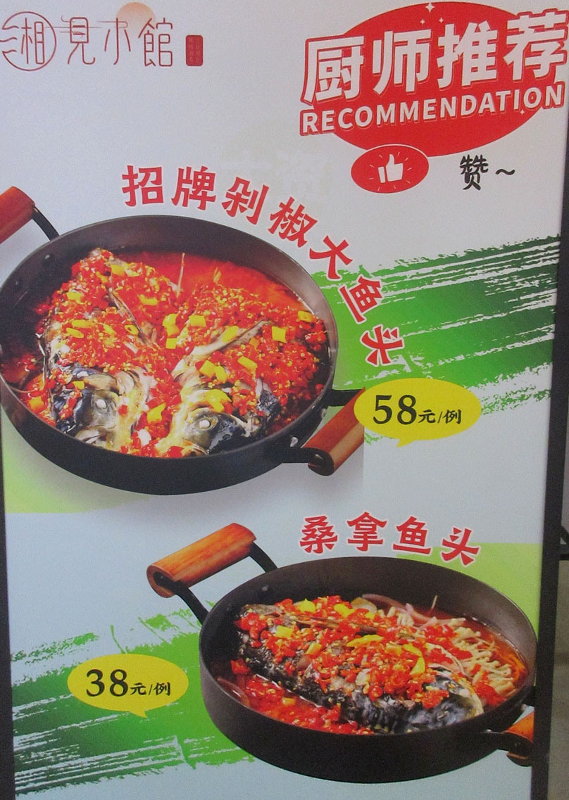 新天地三楼餐饮区南扶梯东侧 湘见小馆 厨师推荐:招牌剁椒大鱼头58元1例、桑拿鱼头38元1例