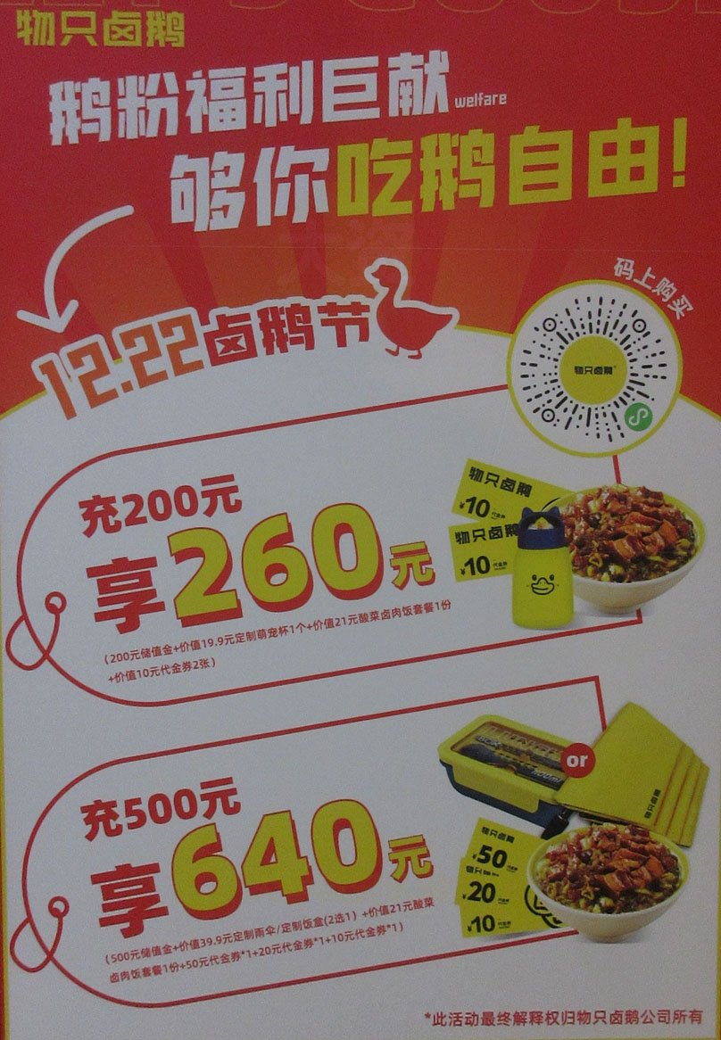 新天地三楼餐饮区南东内转角 蛙来了对面 物只卤鹅 鹅粉福利巨献 12.22卤鹅节 充200元享260元、充500元享640元 | ||||||