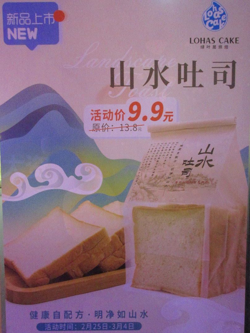 新天地二期一楼西南门 绿叶居 新品上市 山水吐司原价13.8元活动价9.9元 2月25-3月4号 五谷杂粮-大自然的馈赠 | ||||||