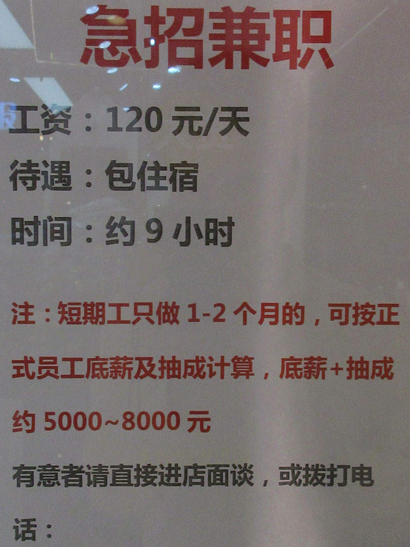 新天地二楼中列铺位南端首店 爱依服急招兼职 工资120元1天 待遇包住宿 时间约9小时 有意者请直接进店面谈