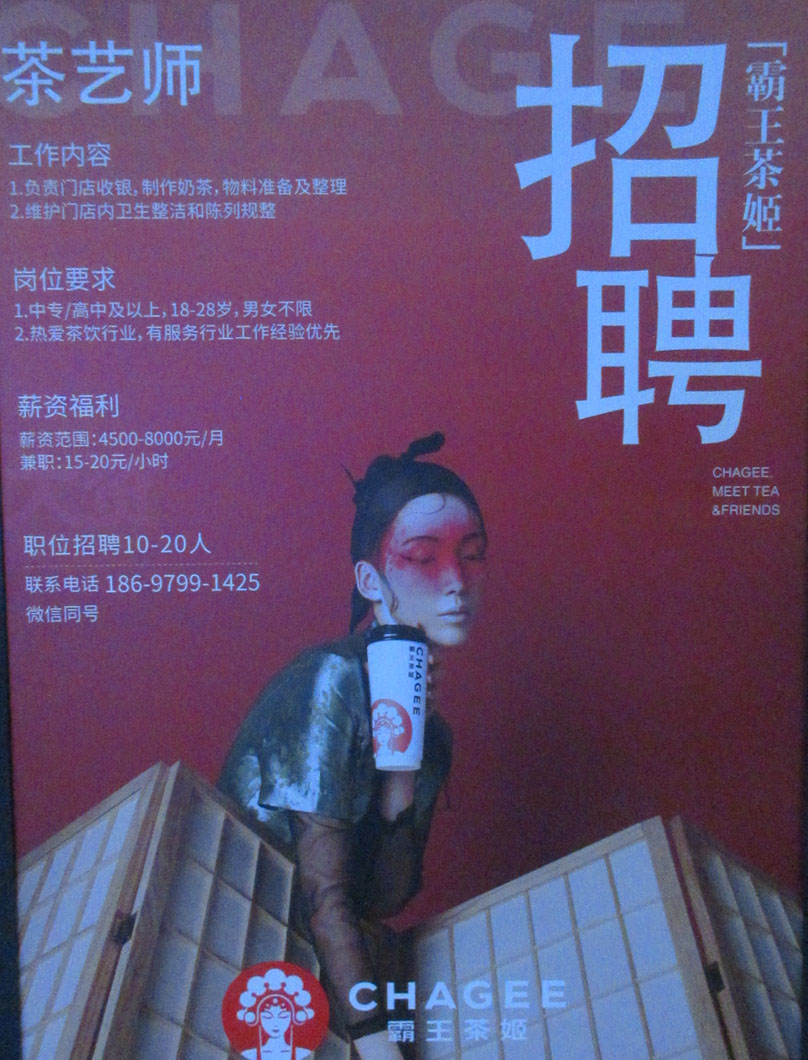 GOGO西街内列中北 新开店-霸王茶姬 招聘茶艺师 工作负责制作奶茶,物料准备等,要求18-28岁,热爱茶饮行业 薪资4500-8000元,兼职15-20元1小时 招10-20人 联系电话18697991425 微信同号