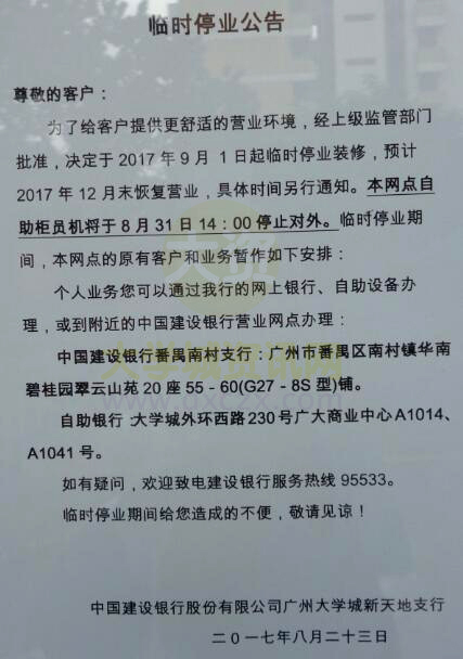 建行大学城总行总营业厅9.1起停业装修(ATM也同时不能使用),预计要12月底才恢复营业 | ||||||