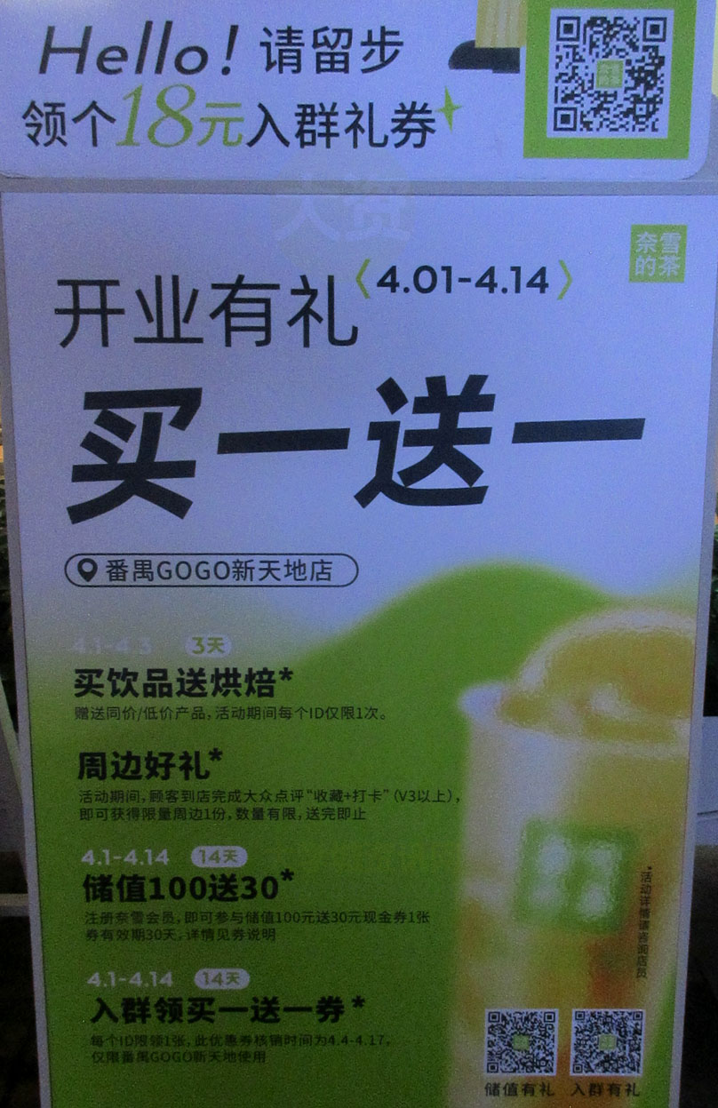 GOGO西街内列中北 之前已经试业有一段时间的新店奈雪的茶,好像今天4月1号是正式开业喔 | ||||||
