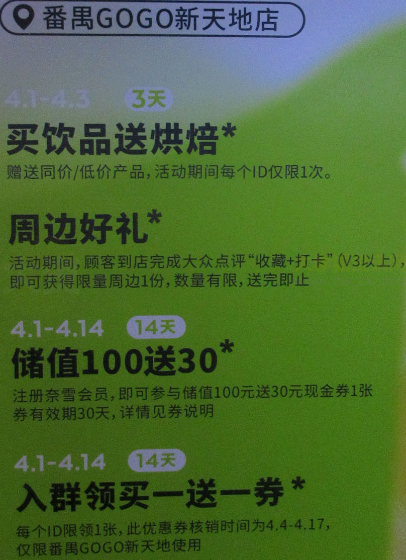 4.1-4.3买饮品送烘焙 大众点评收藏打卡获周边好礼1份 4.1-4.14储值100送30,入群领买一送一券