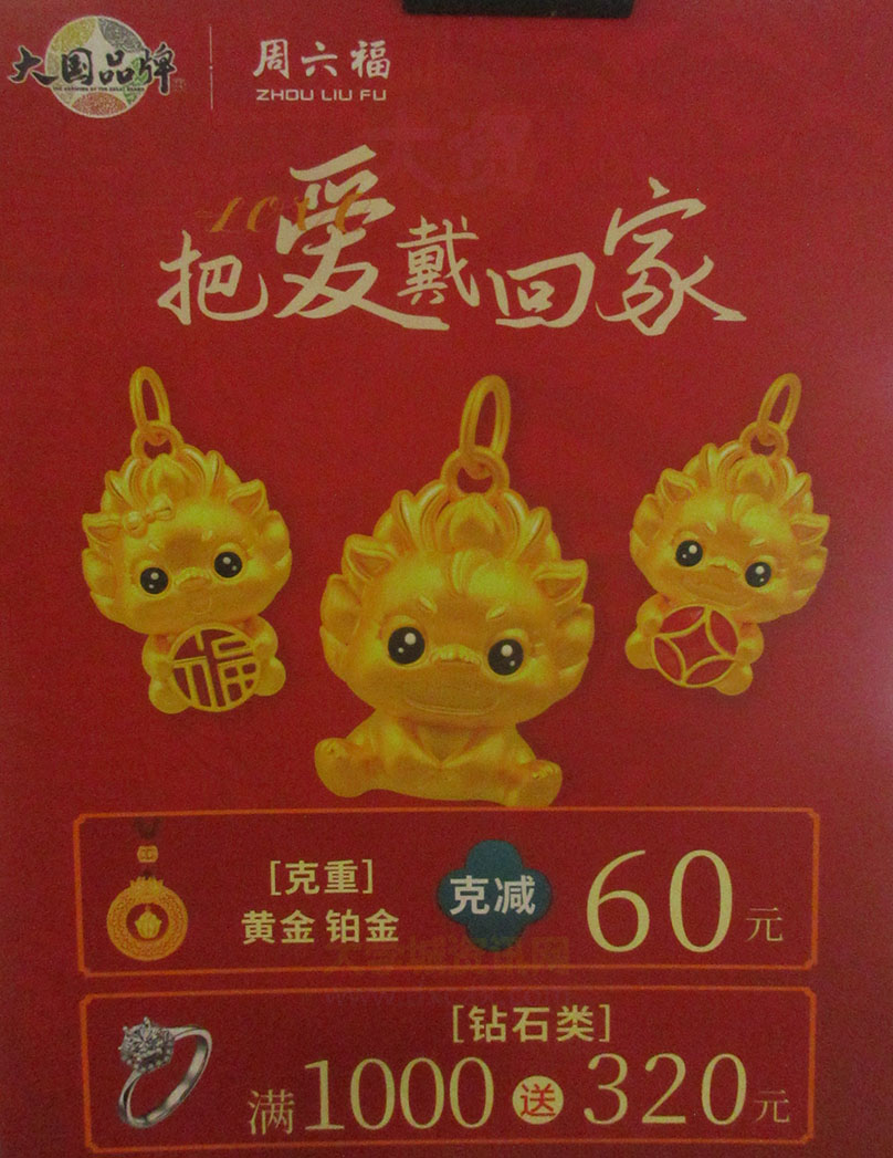 新天地一楼中北 周六福珠宝金店 [克重]黄金 铂金 克减 60元 [钻石类]满1000送320元 | ||||||