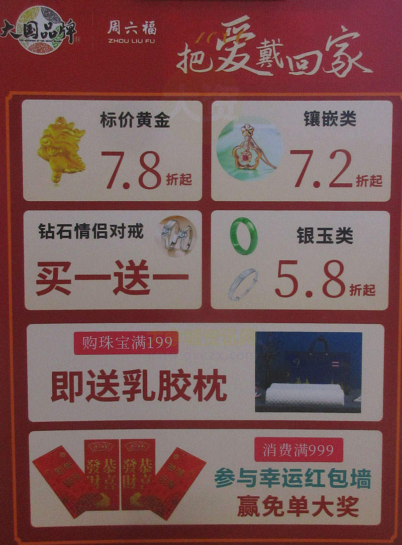 购珠宝满199即送乳胶枕 消费满999参与幸运红包墙赢免单大奖
