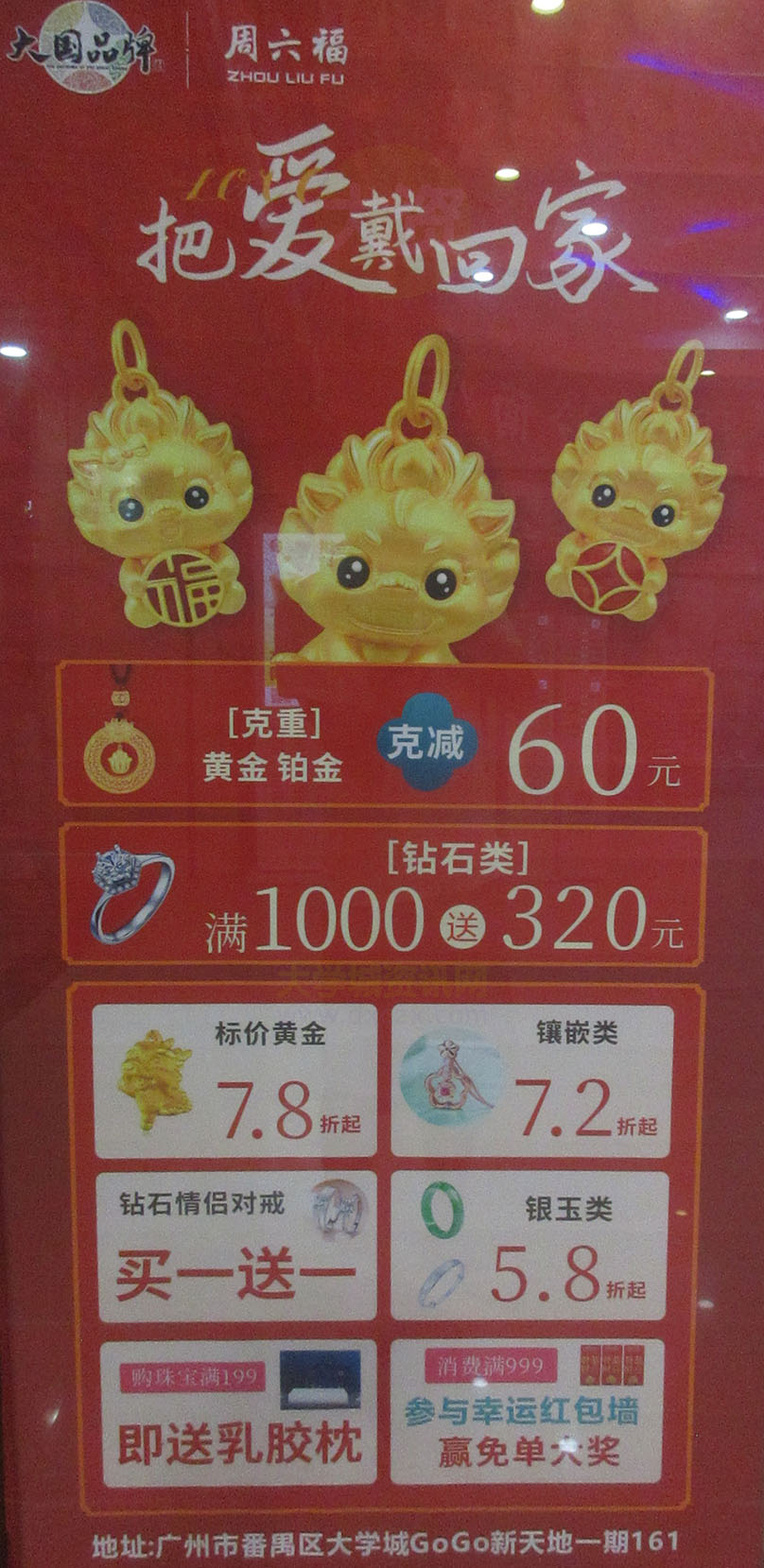 新天地一楼中北 周六福珠宝金店 [克重]黄金 铂金 克减 60元 [钻石类]满1000送320元