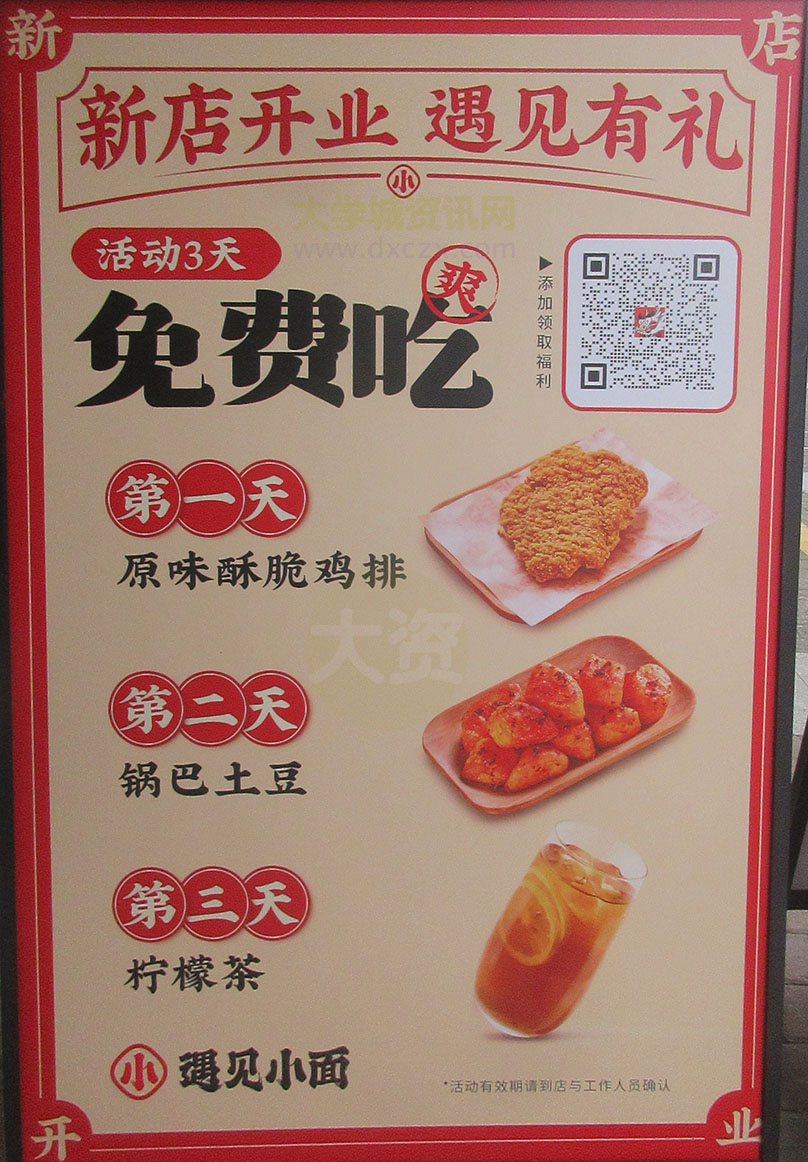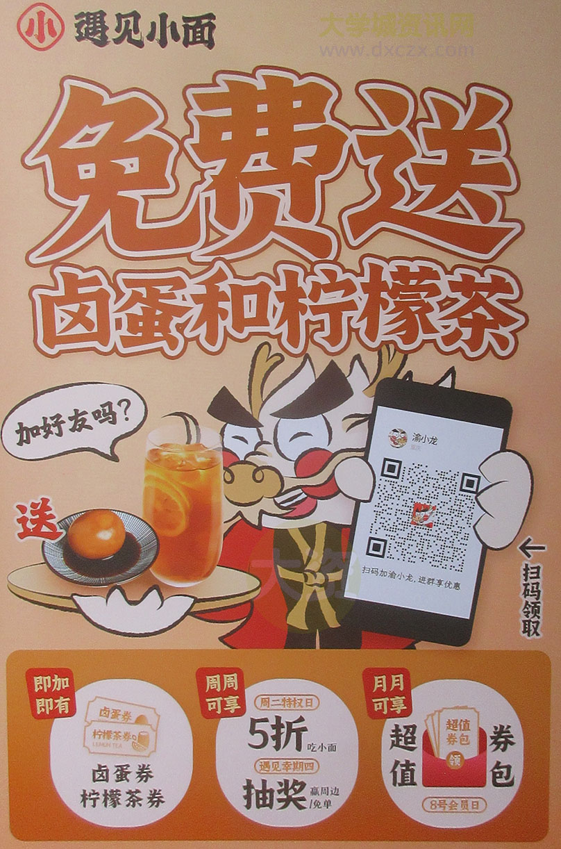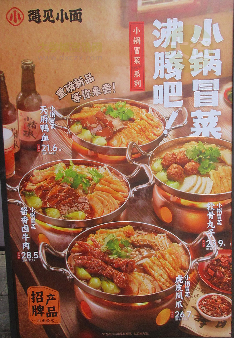 大学城新天地-GOGO西街 新店-遇见小面 开业前三天有免费小吃饮送 以及加好友领取福利 小锅冒菜系列招牌新品:天府鸭血 软骨丸子 酱香卤牛肉 虎皮凤爪 迎新春吉食特惠推荐 下午茶九块九 储值付9折起