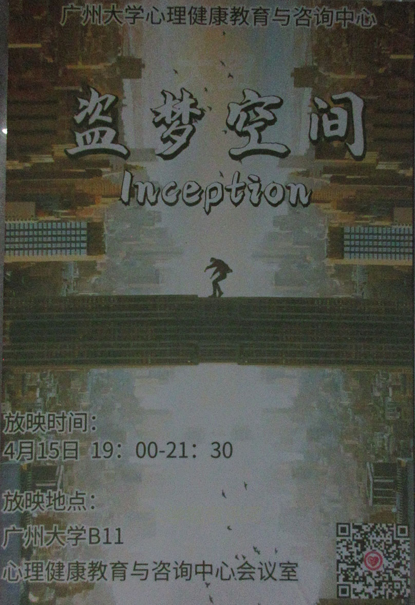 广大生活区竹苑B11东南角-心理健康教育与咨询中心-影视放映预告 盗梦空间 4.15晚19点-21点30 会议室 | ||||||