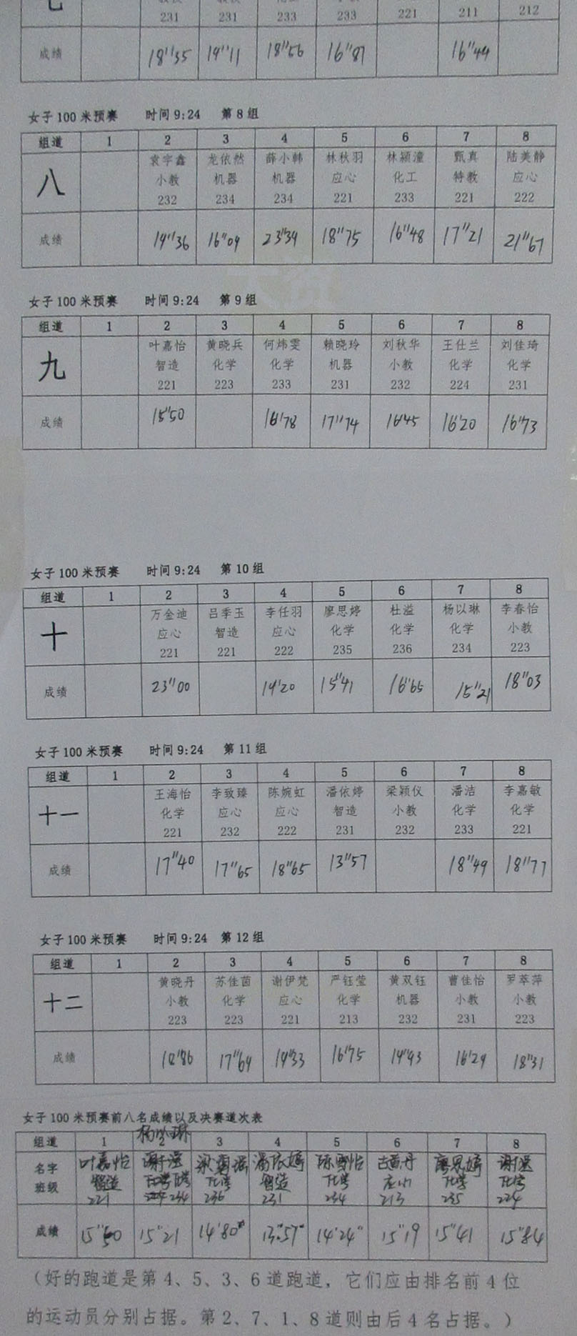 广州大学2023年教育学院 机电学院 化学学院三院联合田径运动会 女子100米预赛各小组计时成绩及最终进入决赛八名选手&道次跑位 | ||||||