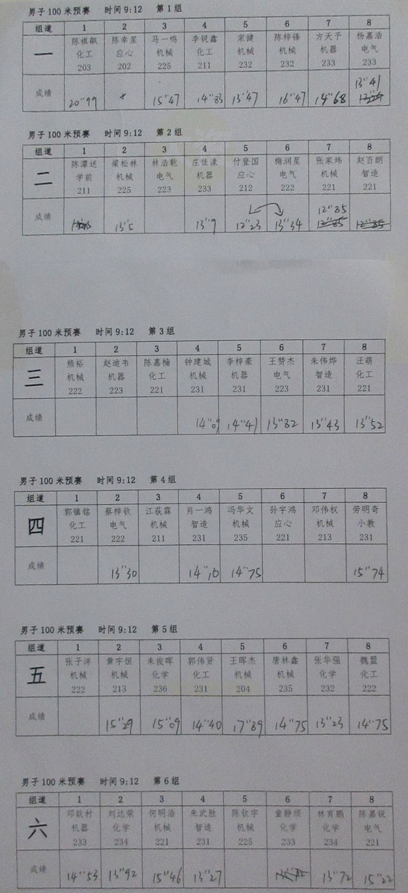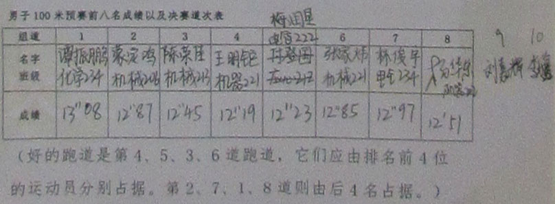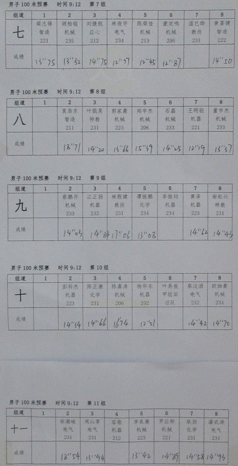 广州大学2023年教育学院 机电学院 化学学院三院联合田径运动会 男子100米预赛各组成绩&晋级决赛前十名&道次排位 | ||||||